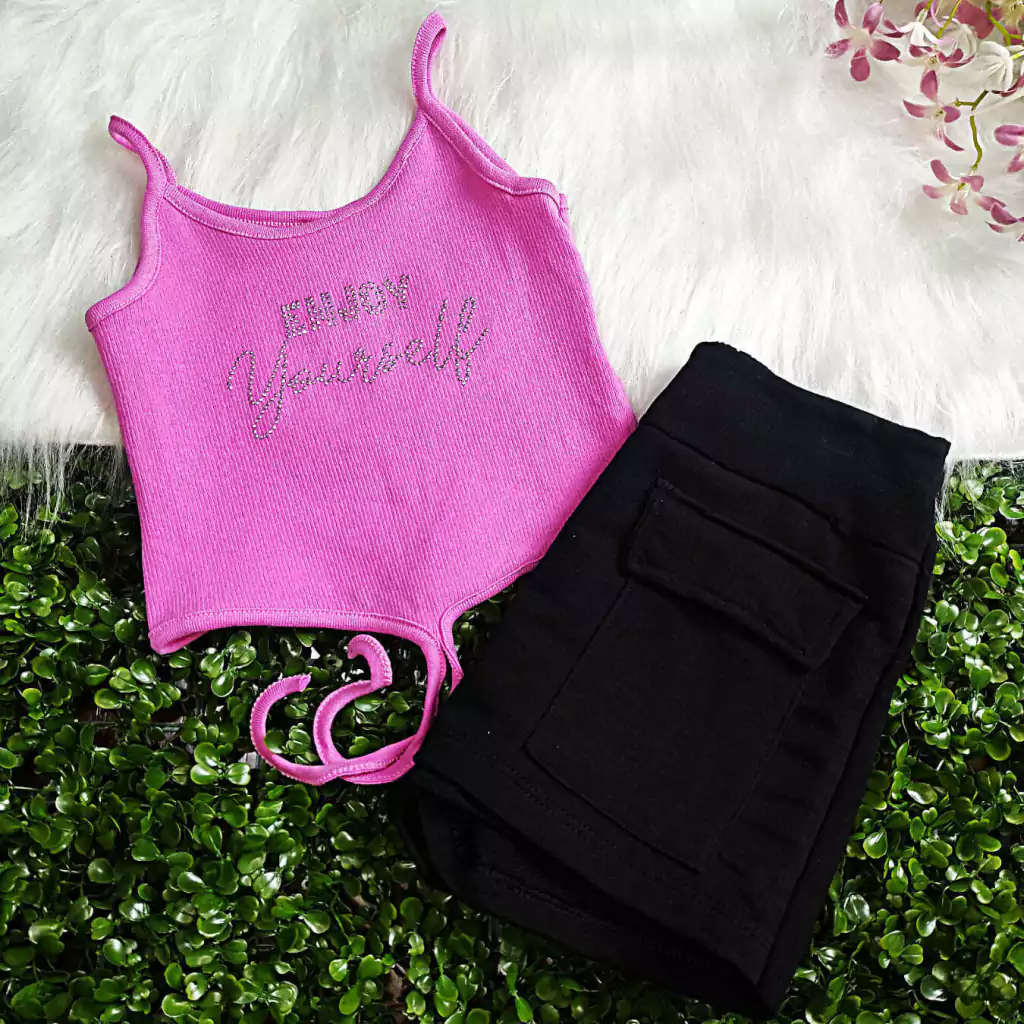 Conjunto Menina Cropped Ribana c/ Aplique e Shorts Saia Moletinho - Didiene